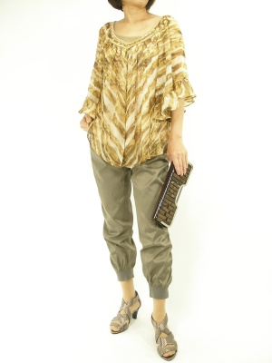 ふんわりブラウスとゆるパンツのコーディも地味色でまとめると辛口の仕上がります!スタイリッシュ度80%、アクティブ度20%。
