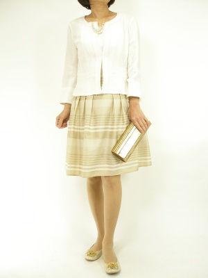 清潔感のある白とベージュの着こなしは、キチンと見えてソフトな印象も与えます!エレガンス度80%、フェミニン度20%。