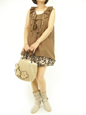 フリルたっぷりの甘口アイテムはパステルカラーよりブラウンをチョイスするのが大人流!フェミニン度90%、スタイリッシュ度10%。