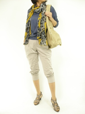 ゆるゆるコーディはふんわりカバーしながらも、手首と足首の細さをアピールするのがお洒落に見せるコツ!スタイリッシュ度70%、アクティブ度30%。