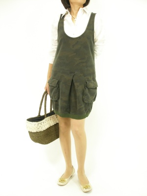 カジュアル度の高いスエット地のジャンスカには、白シャツをインすると清潔感が出ます!アクティブ度90%、スタイリッシュ度10%。