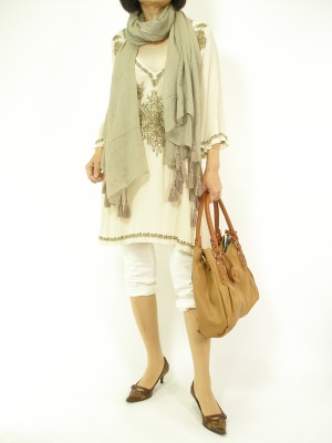 刺繍のチュニックにタッセルの付いたストール。エスニックアイテムは淡色コーディで上品に!スタイリッシュ度70%、アクティブ度30%。