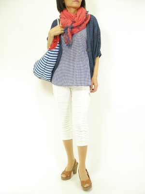トリコロールカラーでまとめた夏らしいマリンスタイル。赤の分量は少なめ、が大人っぽい!アクティブ度80%、フェミニン度20%。