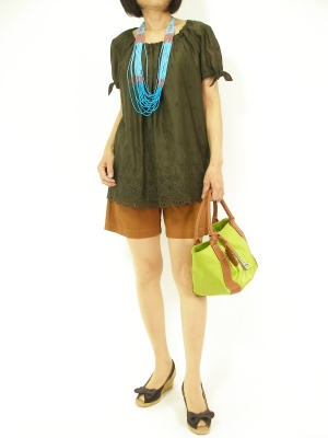 ふんわりブラウスをリゾート風にコーディネート。ブラウンにターコイズブルーが良く映えます!フェミニン度60%、アクティブ度40%。
