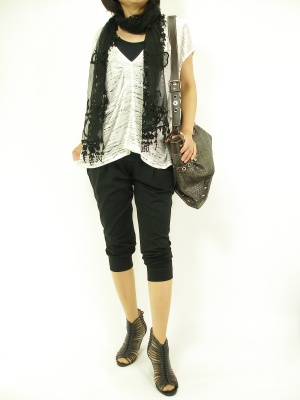 モノトーンの組合せは一見地味色ですが、大胆な開きのカットソーで大人のコーディネート!スタイリッシュ度100%。