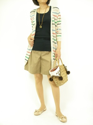 ロングカーディガンはショートパンツでカジュアルに着こなしたい。マルチボーダーがキュートですね!アクティブ度70%、フェミニン度30%。