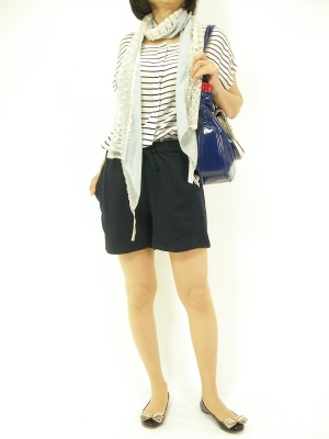 マリンなコンビネゾンは、シンプルコーディが可愛い。フラットシューズでフレンチな雰囲気に!フェミニン度80%、アクティブ度20%。