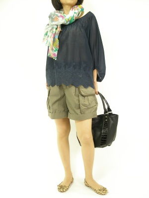 ふんわりしたブラウスとゆったりショートパンツで作る、夏の休日スタイル。柄ストールでアクセントをつけて!アクティブ度100%。
