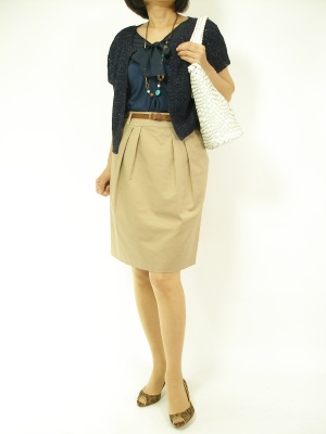 ONのファッションに欠かせないタイトスカート。ブラウスのリボンが甘さをプラス。合わせたカーディを同色にして、あまり目立ちにくく、それでいてお洒落なコーディです!スタイリッシュ度90%、エレガンス度10%。