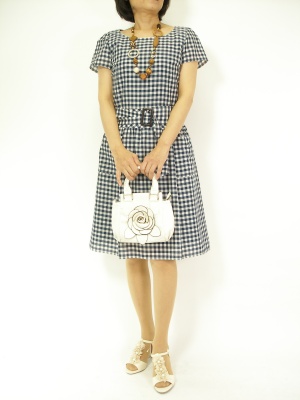 清楚なギンガムチェックのワンピースは夏のお出かけにピッタリ。フェミニンンな小物使いで誰からも好かれるスタイルに!フェミニン度90%、エレガンス度10%。