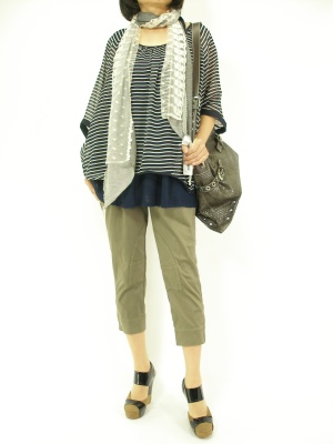 流行りのゆるコーディはストールやショルダーバッグで縦のラインを強調すればスッキリまとまります!スタイリッシュ度60%、アクティブ度40%。