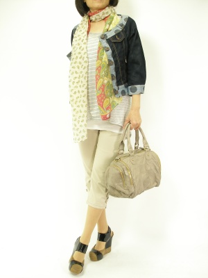 長めのタンクとパンツは淡色でまとめて、デニムのショートジャケットで引き締めたメリハリのあるカジュアルです!スタイリッシュ度60%、アクティブ度40%.