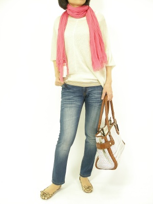 ルーズな夏のニットにはやはりブルーデニムがお似合い。ゆったりトップスにはストールで縦のラインを作るのがお薦めです!アクティブ度90%、スタイリッシュ度10%。