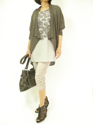 ルーズなトップスのレイヤード。サラリと流したカーディで少しエレガントに見せたい!スタイリッシュ度80%、アクティブ度20%。