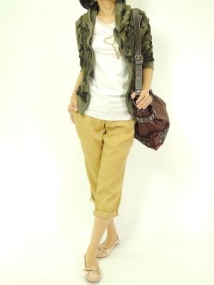 迷彩パーカのカジュアルコーディもパンツを柔らかい素材の物にすると大人っぽくこなれた感じに!アクティブ度90%、スタイリッシュ度10%。
