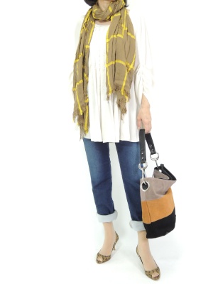 エレガントなとろみブラウスはカジュアルに着こなすのもお薦め!スタイリッシュ度60%、アクティブ度40%。