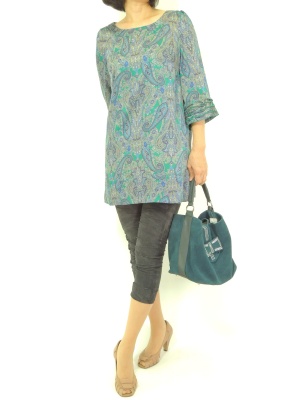秋色ペーズリーのチュニックはダークトーンのスキニーパンツでキレイ目にまとめて!フェミニン度70%、エレガンス度30%。