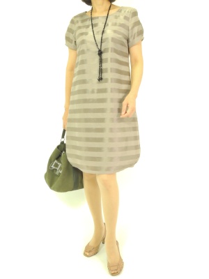 光沢ボーダーの上品なワンピース。お袖や裾の丸いラインが優しい印象です!エレガンス度70%、フェミニン度30%。
