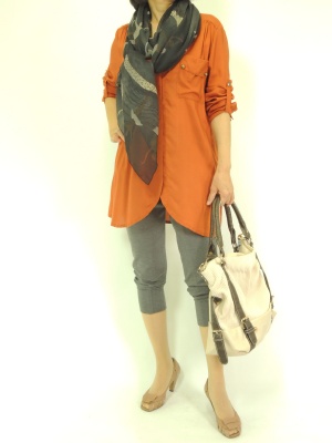 キレイなオレンジ色のブルウスはグレーを合わせるとより秋らしシックに見えます!スタイリッシュ度90%、アクティブ度10%。