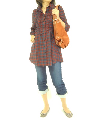 カジュアル派の定番、チェックシャツもチュニックなら少しフェミニンさがプラスされます!アクティブ度80%、フェミニン度20%。