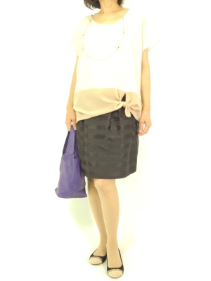 ふんわりしたアイテムでまとめたフェミニンコーディネート。少し短めのスカートならもたつかず、スッキリです!フェミニン度70%、エレガンス度30%。