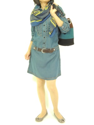 カジュアルなダンガリーワンピはストールでアクセントをつけて!アクティブ度80%、フェミニン度20%。