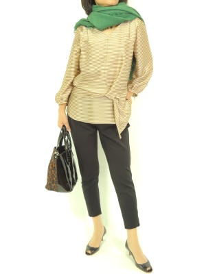 お馴染みのボーダーもつやありブラウスならカジュアルすぎず、カッコ良く決まります!スタイリッシュ度90%、アクティブ度10%。