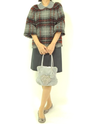季節感たっぷり、チュニックのトップスには付け衿とシンプルスカートを合わせて。ランチにもお薦めのキレイ目スタイルです!フェミニン度90%、エレガンス度10%。
