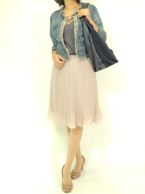 甘口のプリーツスカートにはあえてデニムのジャケットを合わせてテーストMIXを楽しんで!フェミニン度80%、アクティブ度20%。
