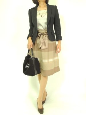 ふんわり広がる甘口スカートを黒のジャケットで引き締めて。女性らしい甘辛MIXスタイルです!エレガンス度70%、スタイリッシュ度30%。