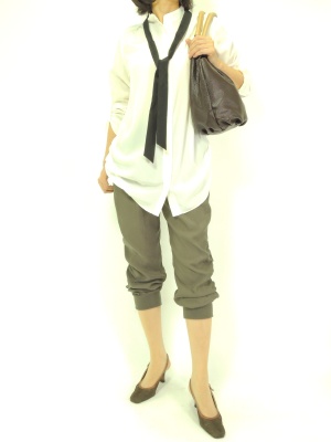 とろみブラウスとソフトパンツで作る、キレイ目ゆるコーディ。黒のタイが縦長ラインを強調するのでスッキリまとまります!スタイリッシュ度90%、アクティブ度10%。
