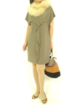 季節感のないとろみワンピースにはムートンスヌードを。秋の始めはこんなオシャレが楽しめますね!エレガンス度80%、スタイリッシュ度20%。