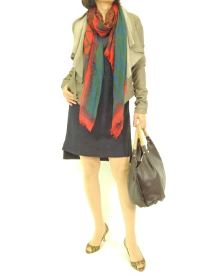ワンピースにレザージャケットを合わせた辛口コーディネート。インパクトストールをサラリと垂らすとさらにクールな印象に!アクティブ度90%、エレガンス度10%。