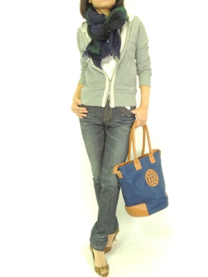 パーカとデニムのデイリーカジュアルにはストールをプラスして秋らしく!アクティブ度100%。