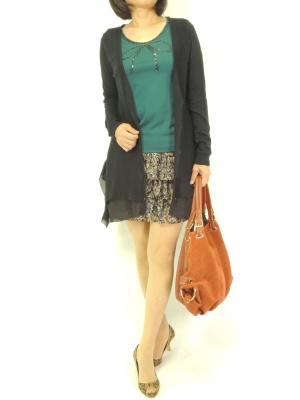 ミニのティアードスカートにはロングカーディを合わせると大人っぽくまとまります!フェミニン度80%、スタイリッシュ度20%。