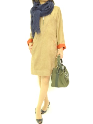ワンピースのキャメルを中心に折り返しのオレンジ、ストールのネイビー、バッグのグリーンと色を効かせたコーディネート!エレガンス度70%、スタイリッシュ度30%。