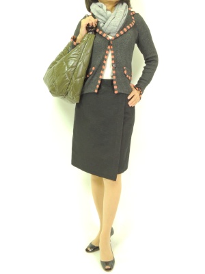通勤もOKなキチンとスタイルですが、ニットジャケットとストリッチスカートなので実はとても楽チンです!スタイリッシュ度80%、フェミニン度20%。
