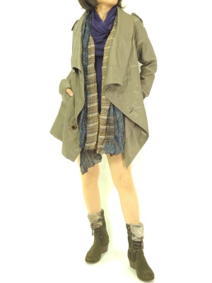 個性的な変形コートにストールをプラスしてボリューム感を楽しんで。ショートパンツも大人っぽく着こなせます!スタイリッシュ度90%、アクティブ度10%。