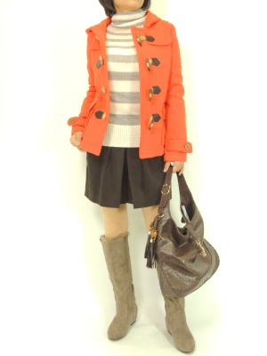 鮮やかなオレンジのダッフルコートにはショートパンツを合わせて可愛く元気に!フェミニン度60%、アクティブ度40%。