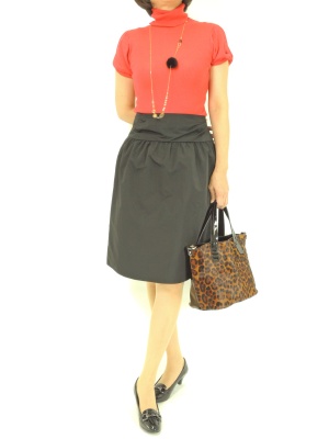 ウエストのギャザーが可愛いスカートはシンプルニットですっきりと着こなしたい!フェミニン度80%、エレガンス度20%。