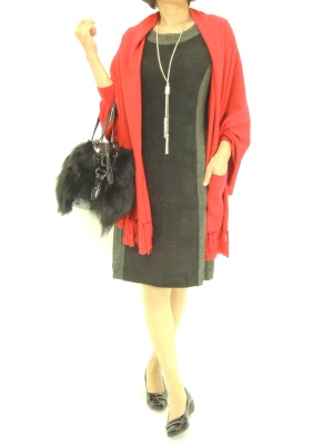 ストール風カーディはシンプルワンピにもよく合います。キレイな赤が冬によく映えます!エレガンス度70%、スタイリッシュ度30%。