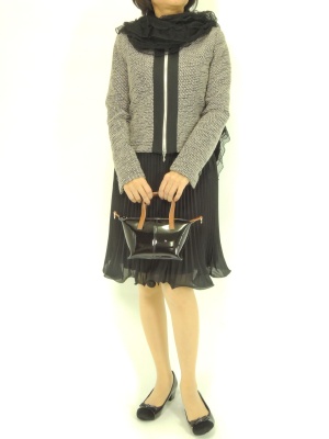 ストールとプリーツスカートがヒラリと揺れる上品なコーディネート!エレガンス度90%、フェミニン度10%。