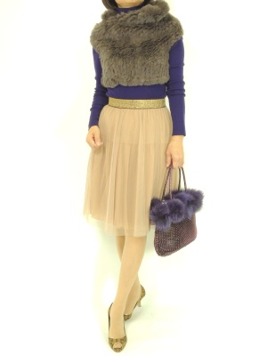 パープルを効かせた上品な着こなし。コンパクトなファーをプラスすると華やかに!エレガンス度80%、スタイリッシュ度20%。