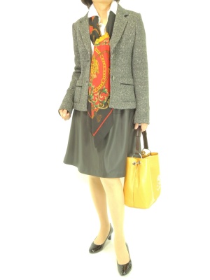 キチンとして見えるコーディネートも、カジュアル素材のジャケットやフェイクレザーのスカートで遊び心をのぞかせて!スタイリッシュ度90%、エレガンス度10%。