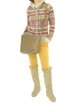 マルチカラーのファー付きカーデ。冬のカジュアルのお洒落が楽しくなりますね!アクティブ度90%、フェミニン度10%。