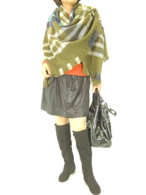 ちょっとしたお出かけに大判ストールがあると便利。フェイクレザーのスカートで少しクールにまとめて!フェミニン度60%、スタイリッシュ度40%。