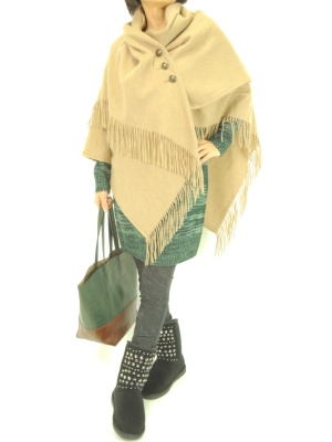ニットワンピとレギパンのデイリーカジュアルにも合わせやすいケープ。コートはいらないけど・・・という時にも便利です!アクティブ度80%、スタイリッシュ度20%。