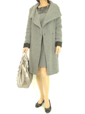 落ち着いたグレー系のコーディネート。コートとワンピースの丈のバランスが若々しく見せるポイントです!エレガンス度90%、スタイリッシュ度10%。