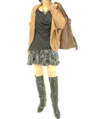 ヒラヒラミニはロングブーツを合わせれば大人可愛く着こなせます。ボリュームトップスで程よくカジュアルに!スタイリッシュ度80%、アクティブ度20%。