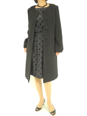 ワンピースのフロッキードットとコートのクルミボタンをリンクさせてオールブラックを華やかに!エレガンス度90%、フェミニン度10%。